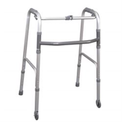 Deambulatore pieghevole costruito in alluminio anodizzato leggero con manopole imbottite, dotato di due ruote fisse frontali e due gambe posteriori, puntali in gomma antiscivolo.