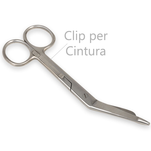 Forbice curva taglia bende a punta smussa modello Lister con clip per cintura / taschino.