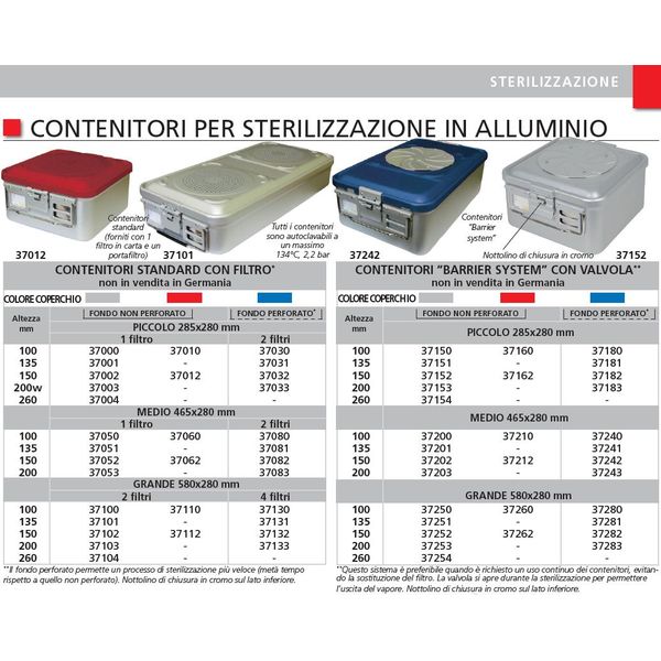 Tutti i container sono autoclavabili al massimo a 134°C e 2,2 bar.