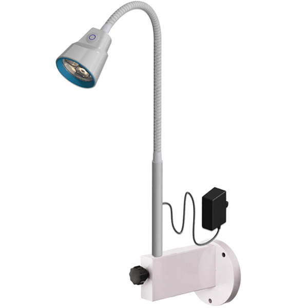 Lampada alogena con braccio flessibile, questa lampada è provvista di una lampadina alogena dicroica da 35 W 12 V, alloggiata all'interno del riflettore e protetta da un vetro temperato. Il riflettore è di ridotte dimensioni in modo da consentire una maggiore libertà nei movimenti. Grazie al braccio flessibile lungo 60 cm la luce può essere orientata in qualsiasi direzione senza interferenze nella vista del medico ed è ricoperto di una guaina protettiva bianca liscia per una pulizia e disinfezione più facili. Dotata di trasformatore elettronico integrato nella base, ferma cavi con protezione spiralata e interruttore bipolare con spia verde. Genera un'intensità di luce di 30.000 lux a 50 cm.