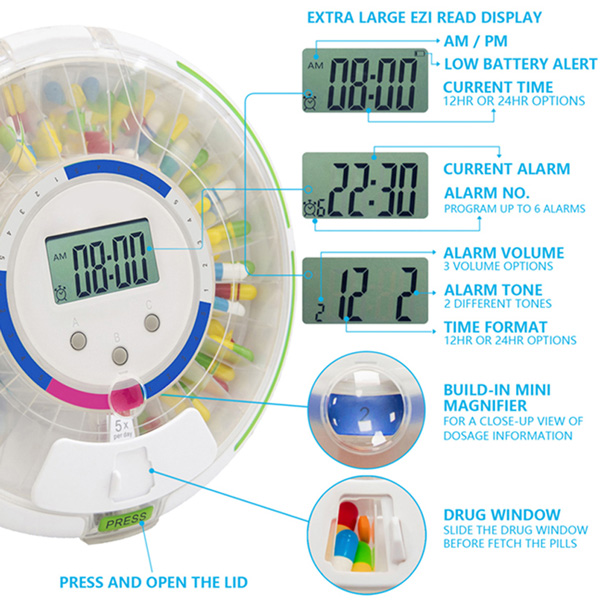 Fino a 9 allarmi acustici e visivi al giorno, che restano attivati per 30 minuti o fino all'apertura del portapillole.